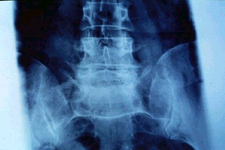 Aspecto radiológico de una espondiloartrosis degenerativa de columna lumbar.